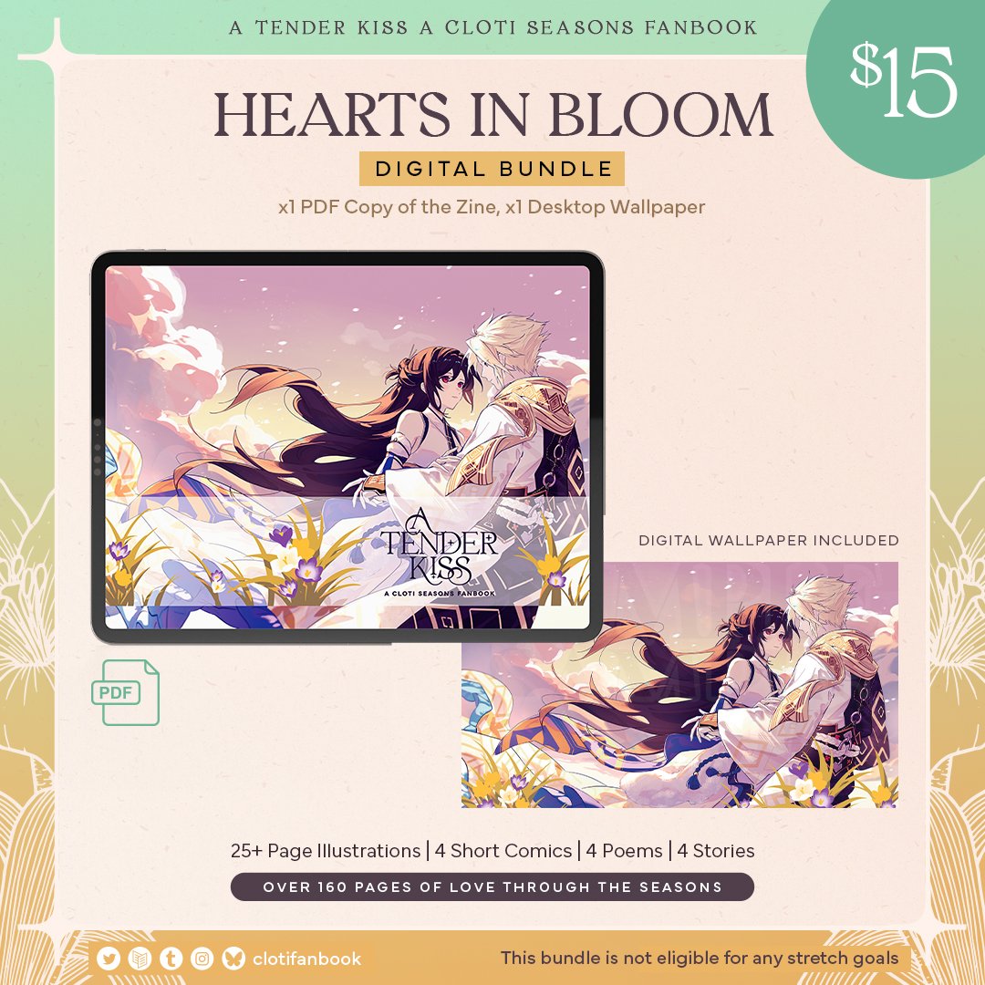 A Tender Kiss is a for-profit, SFW fanbook celebrating CloTi’s love throughout the seasons. The project will showcase their gentle and intimate romance with the help of illustrations, comics, fics, poetry, and merch. After covering for production and shipping, all remaining proceeds will be evenly distributed among our contributors and mod team.